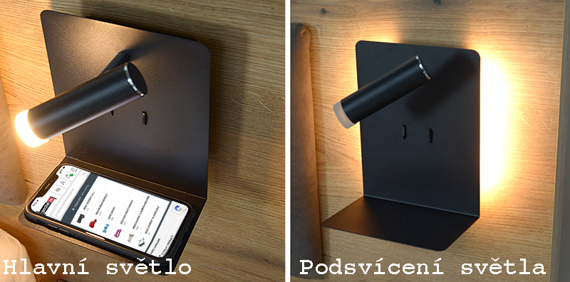 - 2 kusy Led svítidla (v černém nebo bílém provedení) s USB portem. Světlo lze nasměrovat na požadovaný směr, a má dvě polohy svícení (hlavní světlo, a podsvícení svítidla)
